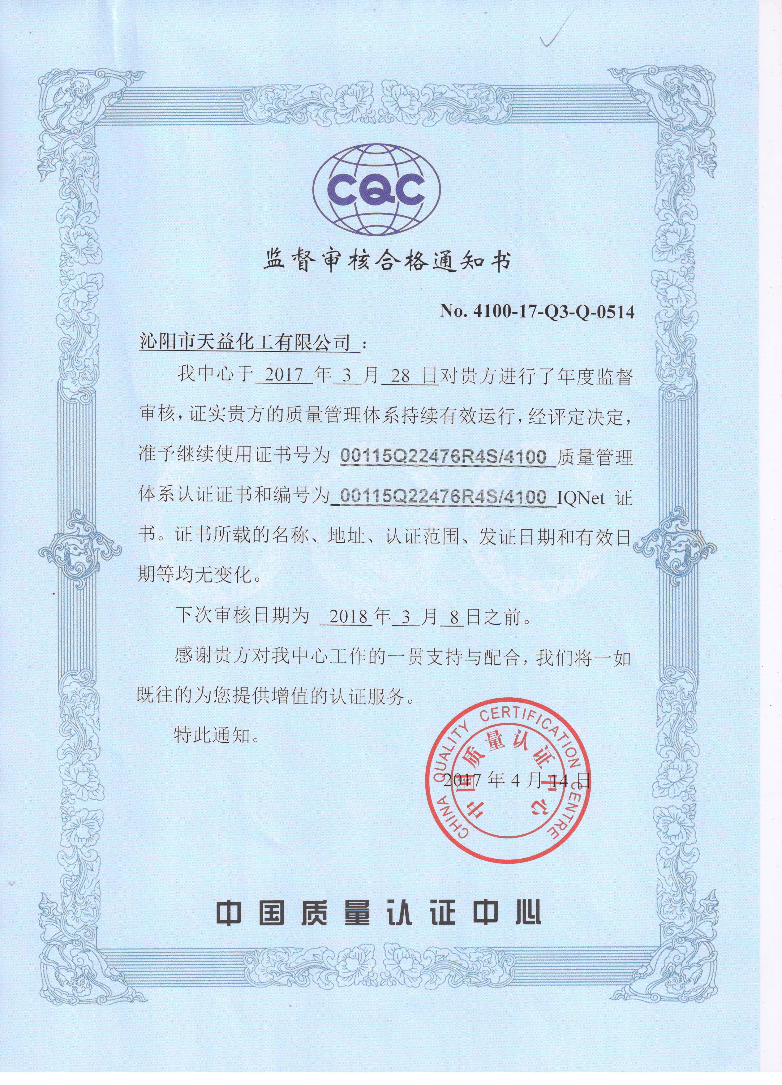 我公司2017年3月28日順利通過,中國質量認證中心年度監(jiān)督審核,我公司的質量管理體系持續(xù)有效運行,經評定決定,準予繼續(xù)使用證書為00115Q22476R4S/4100質量管理體系認證證書和編號為00115Q22476R4S/4100I QNet證書。證書所載的名稱、地址、認證范圍、發(fā)證日期和有效期等均無變化。